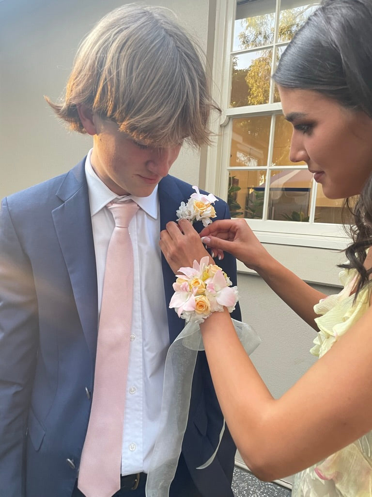 Select a Poppies Flowers wrist corsage to complete your outfit. Mary's expertise in customising blooms to match outfits is renowned throughout Adelaide.